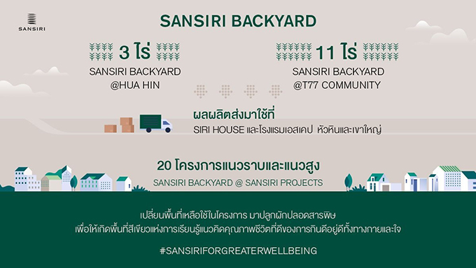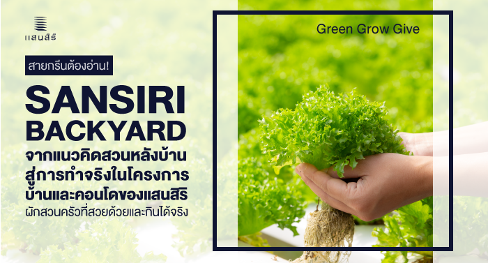 หากใครได้ตาม Hashtag #SansiriBackyard #SansiriOrganicFarm #SansiriGreenMission จะเห็นว่าแสนสิริได้ดำเนินโครงการเพิ่มพื้นที่สีเขียวมาอย่างต่อเนื่อง ซึ่ง Sansiri Backyard นั้นโปรเจกต์ที่มาจากแนวคิดที่ว่าอยากให้คนในเมืองเห็นความสำคัญของการใช้ชีวิตที่ใกล้ชิดกับธรรมชาติ ได้มีคุณภาพชีวิตที่ดีขึ้นจากการรับประทานอาหารที่ปลอดภัย ไร้สารพิษ โดยเริ่มต้นจากหลัก 3Gs คือ Green Grow และ Give