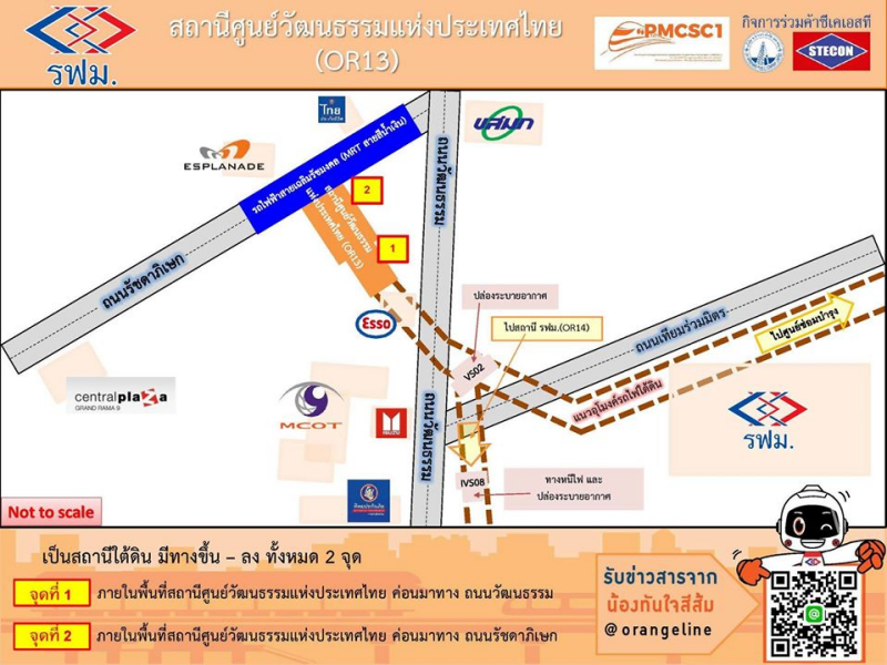 - ทางขึ้นลงจุดที่ 2 ภายในพื้นที่สถานีศูนย์วัฒนธรรม ค่อนไปทางถนนรัชดาภิเษก จุดนี้อยู่บริเวณหน้าเอสพลานาด และบิ๊กซี รัชดาภิเษก