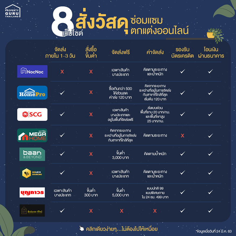 จากสถานการณ์ Covid-19 ห้างสรรพสินค้า ร้านรวงต่างก็พาปิดกันหมด ยกเว้นซูเปอร์มาร์เก็ตและตลาดที่เปิดให้ประชาชนได้ซื้อหาอาหารมาดำรงชีวิตเท่านั้น ร้านขายอุปกรณ์ก่อสร้างแน่นอนว่าก็ต้องปิด ถ้าเกิดบ้านมาพังช่วงนี้ ต้องซ่อมทันทีแบบหลีกเลี่ยงไม่ได้จะทำยังไงดี? แต่ยุคสมัยนี้ไม่ต้องคิดมากแล้วครับ ถ้าหากว่าอาหารมาส่งเราที่หน้าบ้านได้ วัสดุก่อสร้างหรือของแต่งบ้านต่างๆ ก็มาส่งเราได้เช่นกัน วันนี้เช็คราคาขอนำเสนอเว็บไซต์สั่งซื้อวัสดุตกแต่งซ่อมแซมบ้าน-คอนโดออนไลน์ ที่ซื้อเองได้ง่ายๆ ไม่ยุ่งยากมาฝากกัน