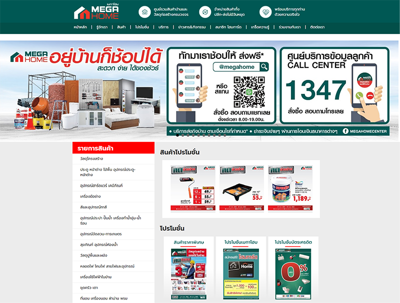 เมกาโฮม ศูนย์จำหน่ายสินค้าวัสดุก่อสร้าง ซ่อมแซม ปรับปรุง ตกแต่งบ้าน และเครื่องใช้ต่างๆ อาทิ บรรจุภัณฑ์พลาสติก โฟม กระดาษ ของใช้สำนักงาน รวมไปถึงประดับยนต์ และสังฆภัณฑ์ สำหรับวิธีซื้ออาจจะไม่เหมือนระบบ Online Shopping ทั่วไปที่สามารถเลือกสินค้าใส่ในตะกร้าสินค้าได้เลย แต่ที่นี่จะใช้ระบบเพิ่มเพื่อนใน line หรือ โทร 1347 อยากได้สินค้าแบบไหนตัวไหนสามารถบอกกับพนักงานได้เลยครับ