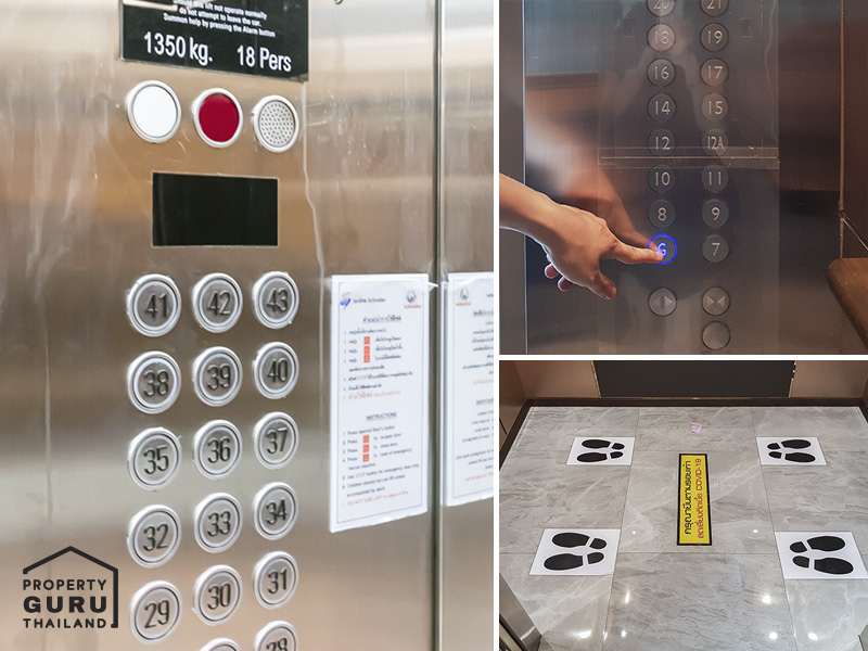 ภายในลิฟต์ก็เป็นอีกจุดเสี่ยง นอกจากจะต้องแออัดอยู่ในห้องแคบๆ ที่อากาศไหลวนอยู่ในนั้น ยังต้องระวังในเรื่องของการใช้นิ้วกดปุ่มลิฟต์อีกด้วย หลายๆ โครงการคอนโดตอนนี้ก็มีการเอาแผ่นพลาสติกแบบเปลี่ยนรายวันมาแปะทับปุ่ม เพื่อป้องกันเชื้อโรคติดที่ปุ่มก็มีบ้างแล้ว และยังขอความร่วมมือให้ยืนห่างกันภายในลิฟต์ แต่ถ้าโครงการไหนยังไม่ได้ป้องกันจุดนี้ เราก็ต้องป้องกันตัวเองไว้ก่อน อาจจะใช้อุปกรณ์เสริมจิ้มไปที่ปุ่มแทน เช่น ฝาปากกา หรือใช้ถุงพลาสติกกันที่นิ้วเรา เป็นต้น