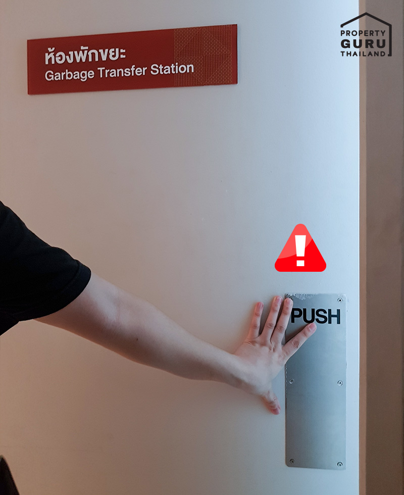 โครงการคอนโดมีห้องขยะที่แยกไว้อย่างเป็นสัดส่วน ส่วนประตูก็มีหลากหลายแบบ บางโครงการก็อาจจะเป็นลูกบิด ราวจับ หรือแบบผลักแบบนี้ จะแบบไหนหลังจากที่เราสัมผัสแล้ว ก็ต้องมาล้างมืออยู่ดีค่ะ