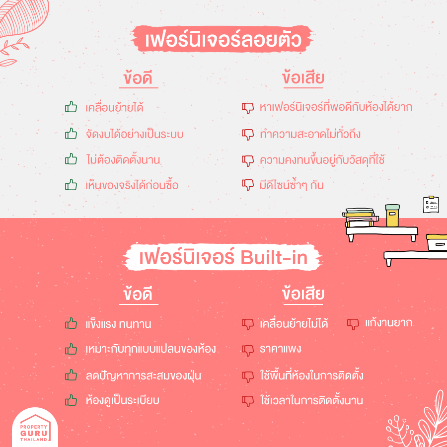 ดูความหมายได้ที่นี่) ซึ่งก็มีข้อดีคือ คุณสามารถออกแบบ ตกแต่ง เลือกซื้อเฟอร์นิเจอร์ได้ตามสไตล์ที่เราชอบได้เลย แต่ก็อาจจะต้องมาคิดก่อนว่า จะแต่งห้องแบบ Built-in หรือใช้เฟอร์นิเจอร์ลอยตัวดี ซึ่งบทความนี้จะมาเปรียบเทียบความแตกต่างของการแต่งห้องสองแบบนี้ว่ามีข้อดี-ข้อเสียแตกต่างกันอย่างไรบ้าง