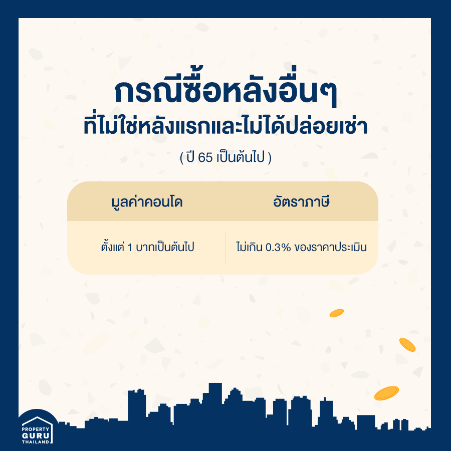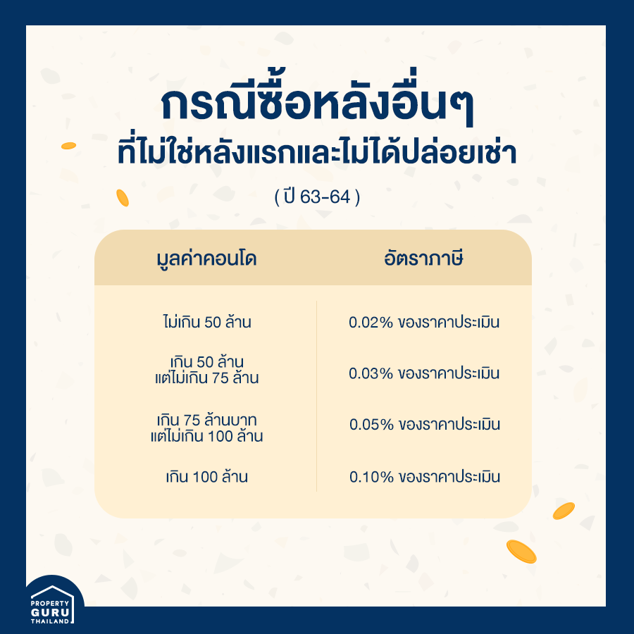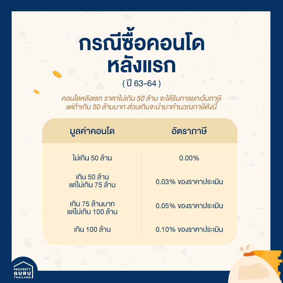 1) คอนโดหลังแรก หรือหลังอื่นๆ ที่ไม่ได้ปล่อยเช่า จะเข้าข่ายใช้ "เพื่ออาศัย" อัตราภาษีมีตั้งแต่ 0% (ยกเว้นสำหรับหลังแรกที่ราคาประเมินไม่เกิน 50 ล้านบาท) ไปจนถึงสูงสุดคือ 0.30% (บ้านหลังแรกราคาประเมินเกิน 50 ล้านบาท) ซึ่งการจะดูว่าเป็นคอนโดหลังแรกหรือไม่ ให้ดูจากว่าเรามีชื่อในทะเบียนบ้านคอนโดห้องไหน ห้องนั้นๆ ก็จะเป็นคอนโดหลังแรก