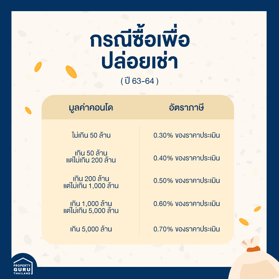 2) มีคอนโดเพื่อ "ปล่อยเช่า" ก็จะเข้าข่าย "ใช้งานเชิงพาณิชย์" อัตราภาษีมีตั้งแต่ 0.30% (2 ปีแรกคือ 2563 และ 2564 สำหรับที่ดินและสิ่งปลูกสร้างที่ราคาประเมินไม่เกิน 50 ล้านบาท) ไปจนถึงสูงสุดคือ 1.20%