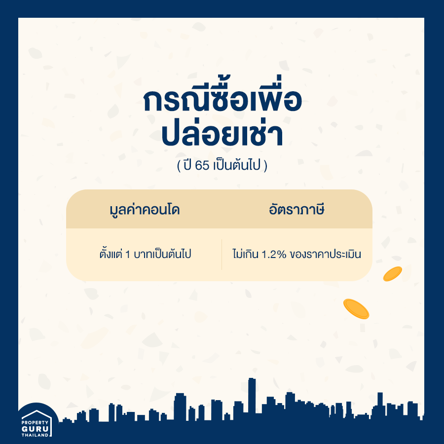 มูลค่าของฐานภาษี x อัตราภาษี = ค่าภาษีที่ดินและสิ่งปลูกสร้าง (ค่าภาษีคอนโด)
