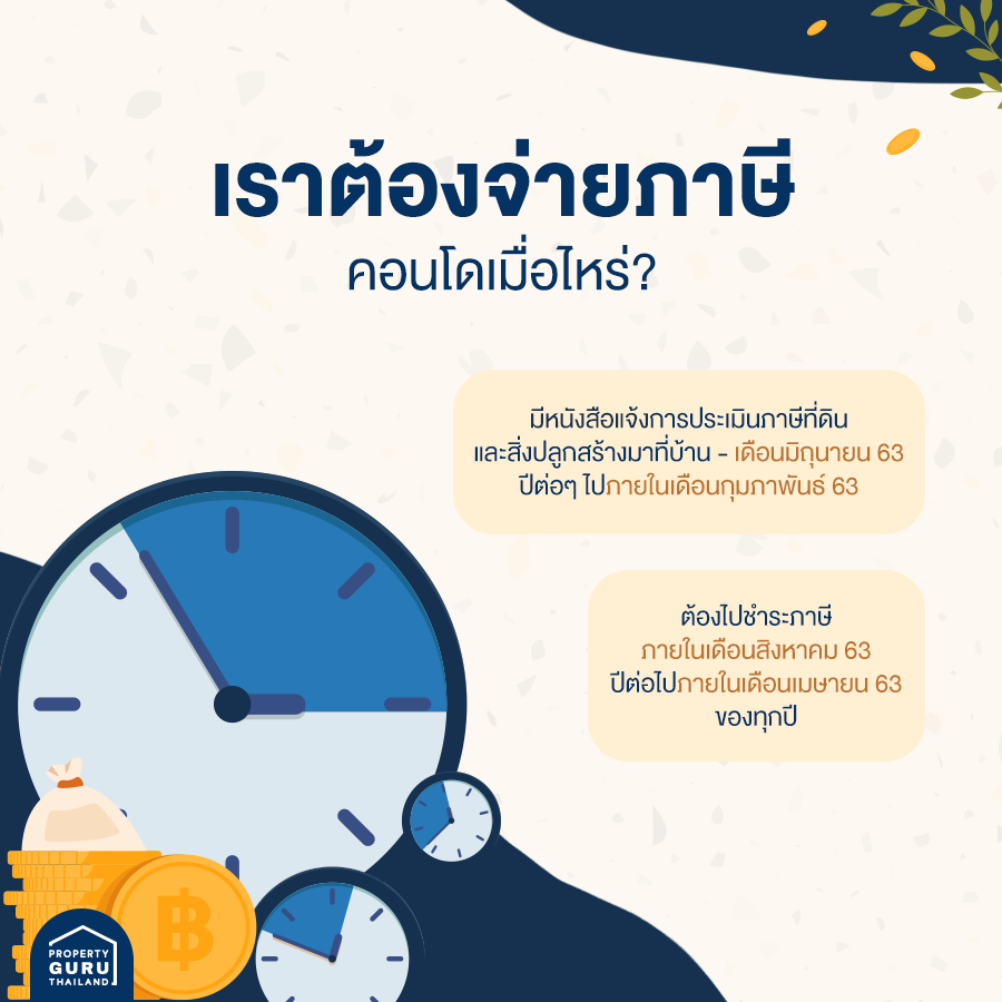 ภาษีที่ดินและสิ่งปลูกสร้างประจำปี 2563 ต้องจ่ายภายในวันที่ 31 สิงหาคม 2563 แต่ในปีต่อๆ ไปกำหนดการจ่ายภาษีจะเป็นเดือนเมษายนของทุกปี