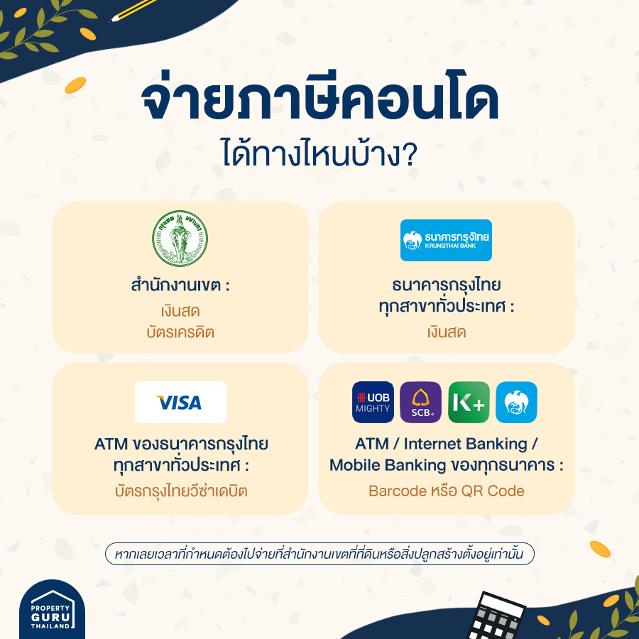 1. ที่สำนักงานเขตที่ที่ดินหรือสิ่งปลูกสร้างนั้นตั้งอยู่ อาทิ คอนโดอยู่ในเขตบางรักก็ต้องนำเงินไปเสียที่สำนักงานเขตบางรัก เป็นต้น หรือสามารถจ่ายได้ที่ธนาคารกรุงไทยทุกสาขาทั่วประเทศ