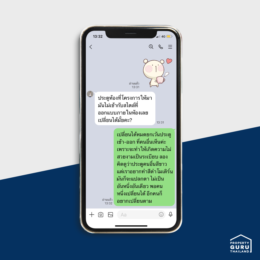 ประตูที่เราเปลี่ยนได้นั้นจะเป็นประตูที่อยู่ในห้องเท่านั้น ไม่ว่าจะเป็นห้องน้ำ ห้องนอน ห้องครัว แต่ถ้าเป็นประตูเข้า-ออกห้องหลัก ประตูที่อยู่ติดกับระเบียง นิติบุคคลจะไม่ยอมให้เปลี่ยนค่ะ เหตุผลหลักๆ ก็จะเป็นเรื่องของภาพลักษณ์โดยรวมของโครงการนั่นเอง ดังนั้น เปลี่ยนประตูทางเข้า-ออกห้อง = ทำไม่ได้