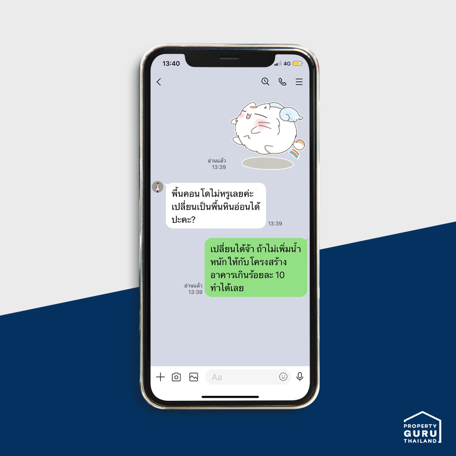 เป็นที่ทราบกันดีว่าส่วนใหญ่พื้นลามิเนตมักจะไม่ทนทานเมื่อเทียบเท่ากับกระเบื้องหรือหินอ่อน ถ้าเราอยากเปลี่ยนพื้นคอนโดของเราสามารถทำได้ แต่ถ้าหากเป็นวัสดุอย่างหินอ่อนนั้นต้องคำนวณน้ำหนักก่อนว่าเกินกว่าโครงสร้างจะรับไหวหรือไม่ และถ้าหากเป็นการเพิ่มน้ำหนักเกินกว่าร้อยละ 10 ต้องทำการขออนุญาตดัดแปลงอาคารต่อสำนักงานเขตให้เรียบร้อย และการปูพื้นใหม่นี้ต้องไม่ไปกระทบกับทางเดินส่วนกลางด้วย สรุปว่า อยากเปลี่ยนพื้นคอนโดเป็นหินอ่อน = ทำได้
