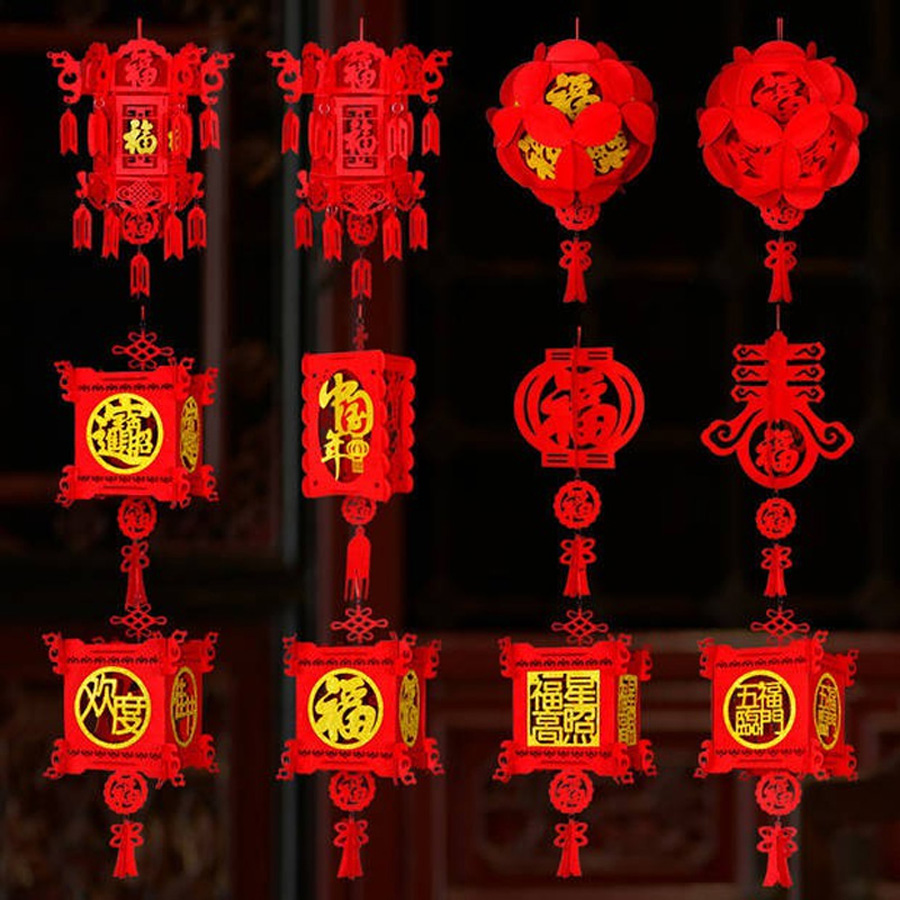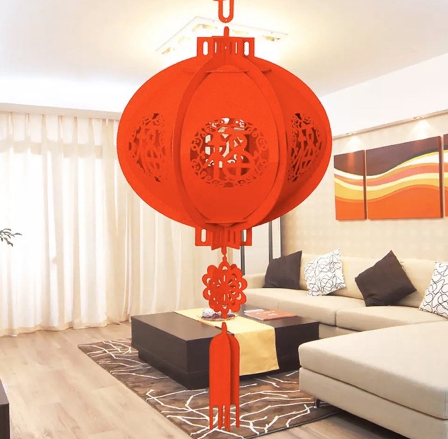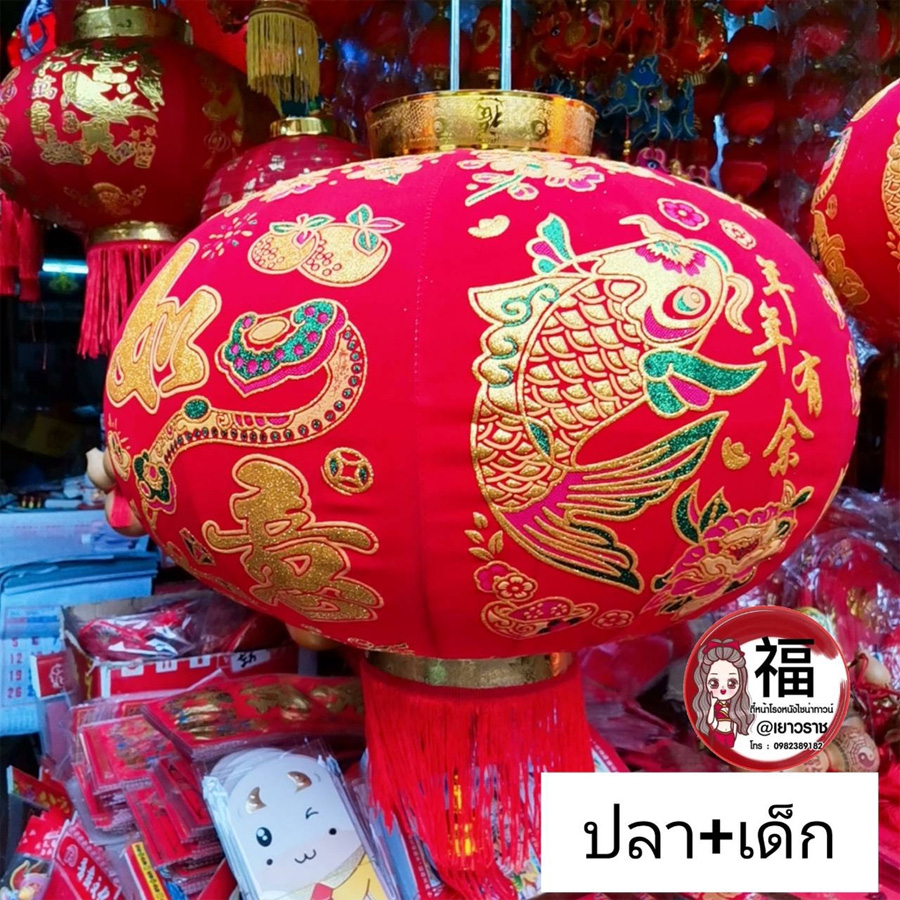 โคมไฟสีแดงก้านร่มวัสดุเป็นผ้ากำหมะหยี่ ขนาด 16 นิ้ว/22 นิ้ว/26 นิ้ว ความหมายดี อาทิ ลายปลา = ความอุดมสมบูรณ์ เหลือกินเหลือใช้, เด็ก = เงินทองเต็มบ้าน และลายประทัด = ชื่อเสียงโด่งดัง เริ่ม 400 - 800 บาท