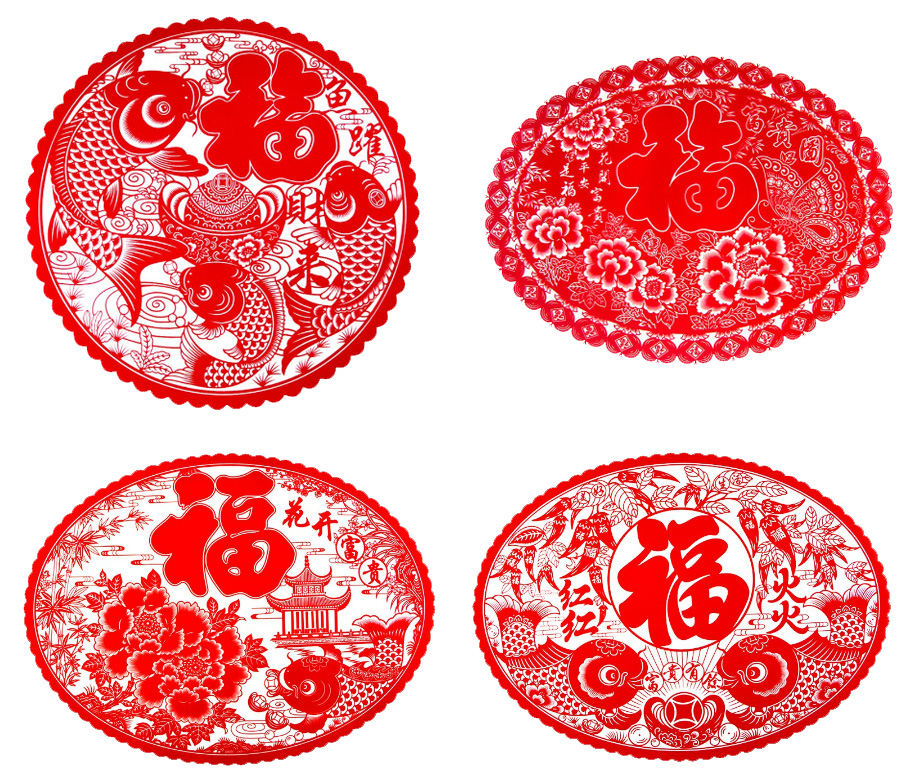 "เปเปอร์คัตติ้ง" คือ การนำกระดาษสีแดงมาตัดหรือฉลุด้วยความปราณีตเป็นลวดลายที่เป็นมงคล นิยมนำมาติดที่ประตูบ้านหรือหน้าต่าง ซึ่งในอดีตการตัดกระดาษถือเป็นกิจกรรมที่เด็กๆ ชาวจีนนิยมเล่นกันอย่างแพร่หลาย จนกลายมาเป็นของประดับตกแต่งบ้านตามเทศกาลต่างๆ โดยลายที่ฉลุออกมานั้นล้วนแล้วแต่มีความหมายที่เป็นสิริมงคลทั้งสิ้น เช่น ปลา หรือ "หยู" หมายถึง ความอุดมสมบูรณ์ มั่งคั่ง ร่ำรวย, ปลาคาร์ฟ หรือ "หลี่" หมายถึง ผลกำไรหรือผลประโยชน์, มังกร หมายถึง โชคลาภ รุ่งเรือง, ดอกเหมย หมายถึง ความมั่งมี, หงษ์ หมายถึง ความรุ่งเรือง, นก หมายถึง ความสุข ความโชคดี เป็นต้น ปัจจุบันมีการพัฒนาทำเป็นสติกเกอร์ เพื่อความสะดวกในการติดหรือตกแต่งที่ประตูหน้าต่างมากยิ่งขึ้น