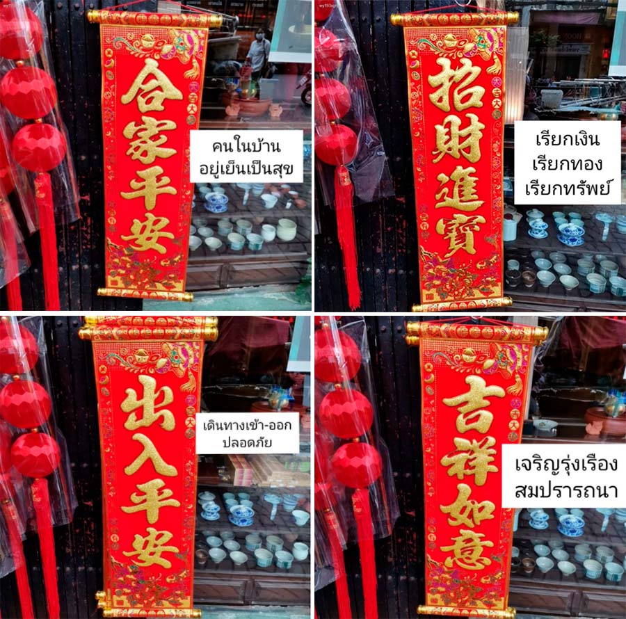 ป้ายคำอวยพรภาษาจีนแบบแขวน 4 คำ ขนาด 25 x 60 เซ็นติเมตร วัสดุทำจากผ้ากำมะหยี่ ตรงแกนล่างและด้านบนทำจากพลาสติก มีให้เลือก 12 คำ เช่น เงินทองไหลมาเทมา, เรียกเงิน เรียกทอง เรียกทรัพย์, สุขภาพร่างกายแข็งแรง, เจริญรุ่งเรือง, สมปรารถนา ราคา 354 บาท จากร้าน