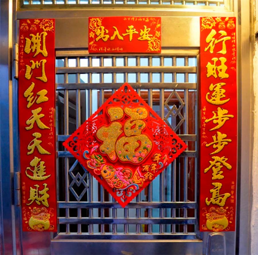 ป้ายกระดาษป้าย ฝู (福) เป็นของมงคลที่นิยมนำมาติดไว้ที่เหนือประตูบ้าน ลักษณะจะเป็นกระดาษสีแดงทรงข้าวหลามตัด เขียนด้วยตัวอักษรคำว่า "ฝู" ไว้บริเวณตรงกลางในลักษณะกลับหัว เพราะในภาษาจีนคำว่า "กลับหัว" เป็นคำพ้องเสียงอ่านออกเสียงเหมือนคำว่า "ที่นี่" เชื่อว่าจะนำพาความสุข โชคลาภ และความมั่งคั่งมาให้ผู้ที่อาศัยอยู่ที่นี่ หรืออยู่ในบ้านหลังนี้นั้นเอง
