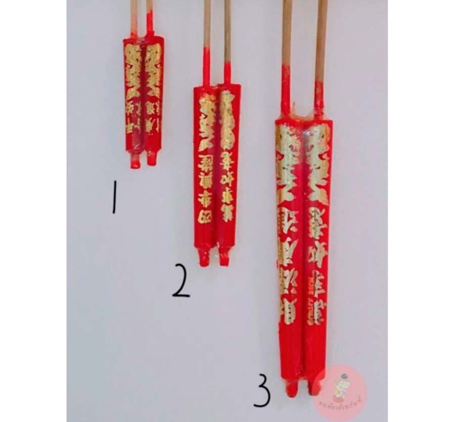 เทียนแดงขาไม้ ลายคำอวยพรภาษาจีน สำหรับไหว้เจ้าไหว้บรรพบุรุษ มีให้เลือก 3 ขนาด ตั้งแต่ขนาด 22 - 41 เซ็นติเมตร เริ่มต้นคู่ละ 9 บาท จากร้าน