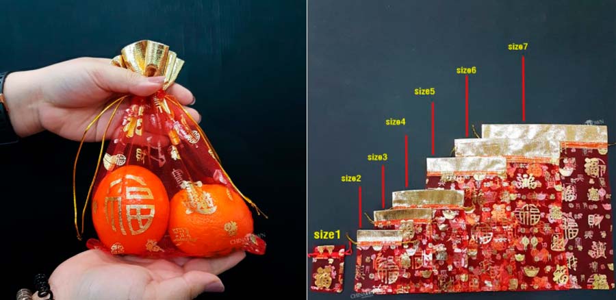 ถุงหูรูดสำหรับใส่ส้มร้อยด้วยเชือกสีแดงและสีทอง นำเข้าจากจีน มีให้เลือก 7 ขนาด ใส่ส้มสายน้ำผึ่งได้ตั้งแต่ 1 - 18 ลูก ราคาเริ่มต้น 7 -25 บาท จากร้าน