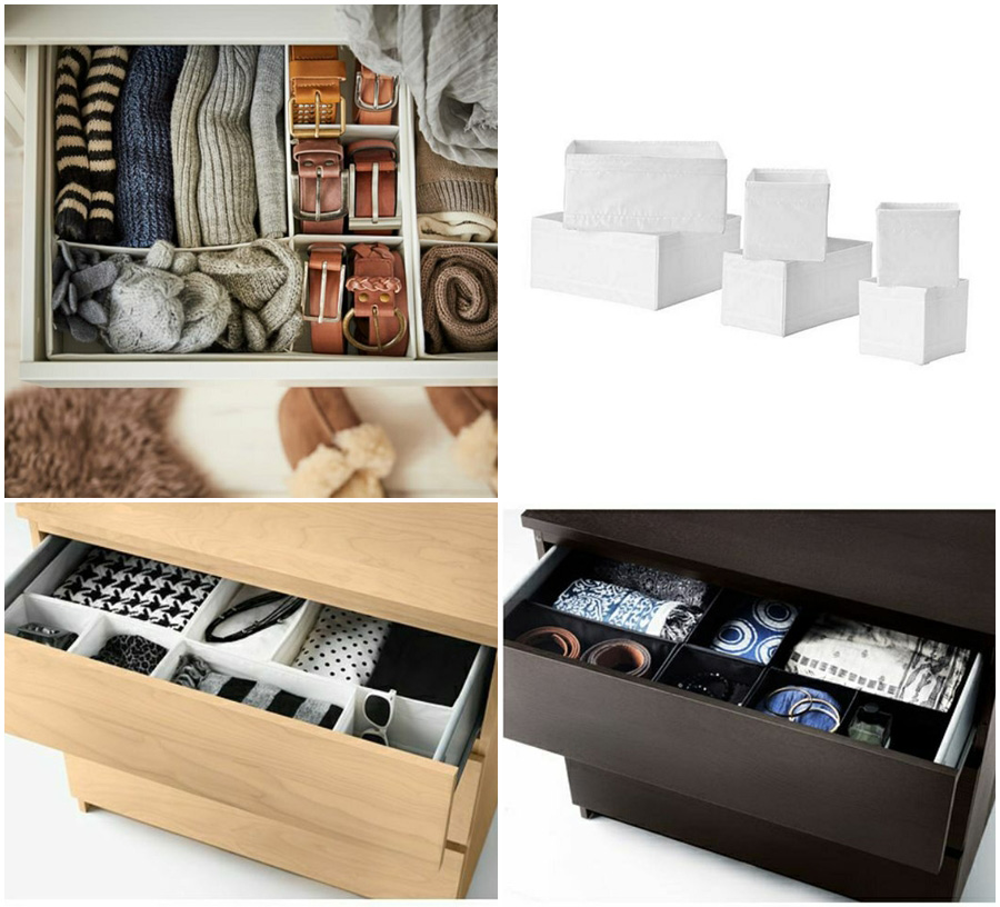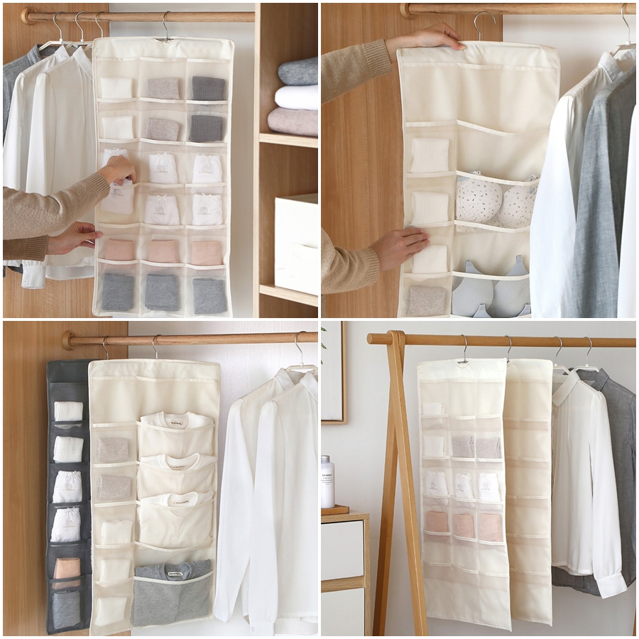 สำหรับเสื้อผ้าชิ้นเล็กๆ อย่างชุดชั้นใน หรือถุงเท้า จากเดิมที่เคยพับและวางปะปนกันดูไม่เป็นระเบียบเท่าที่ควร จะใช้งานแต่ละครั้งก็ต้องเสียเวลาในการหา แต่ปัญหานี้จะหมดไปด้วยเซ็ตจัดระเบียบที่แบ่งเป็นช่องเล็กๆ มีทั้งแบบเป็นกล่องสำหรับจัดวางไว้ในลิ้นชัก และแบบแขวน ตัวช่วยในการจัดเก็บถุงเท้าหรือชุดชั้นในให้อยู่รวมกันเป็นคู่ หยิบใช้งานง่ายมองเห็นได้ทั่วถึง