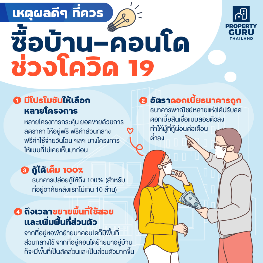 เรียกได้ว่าดีใจกันได้ไม่ทันไร โควิด-19 ระลอกที่ 3 ก็ระบาดมาอีกแล้ว เป็นระยะเวลากว่า 1 ปี ที่เราสวมใส่หน้ากากอนามัย ล้างมือ และ social distancing กันจนเป็นเรื่องปกติ ถึงแม้ว่าจะทำให้เป็นปกติยังไงเราก็ยังอยากได้โลกก่อนโควิดกลับคืนมาอยู่ดี โรคระบาดนี้ถือว่าเป็นวิกฤตหนักที่ต้องเจอกันทั่วโลกเลยค่ะ แต่ในวิกฤตย่อมมีโอกาสเสมอ ใครที่มีกำลังอยากมีที่อยู่อาศัยเป็นของตัวเองไม่ว่าจะเป็นบ้าน ทาวน์โฮม หรือคอนโดช่วงนี้เหมาะมากสำหรับผู้ที่พร้อมทางด้านการเงินค่ะ มาดูกันว่าเหตุผลดีๆ ที่ปฏิเสธไม่ได้เลยว่าทำไมเราต้องซื้อบ้าน-คอนโดช่วงโควิด 19 มีอะไรบ้าง