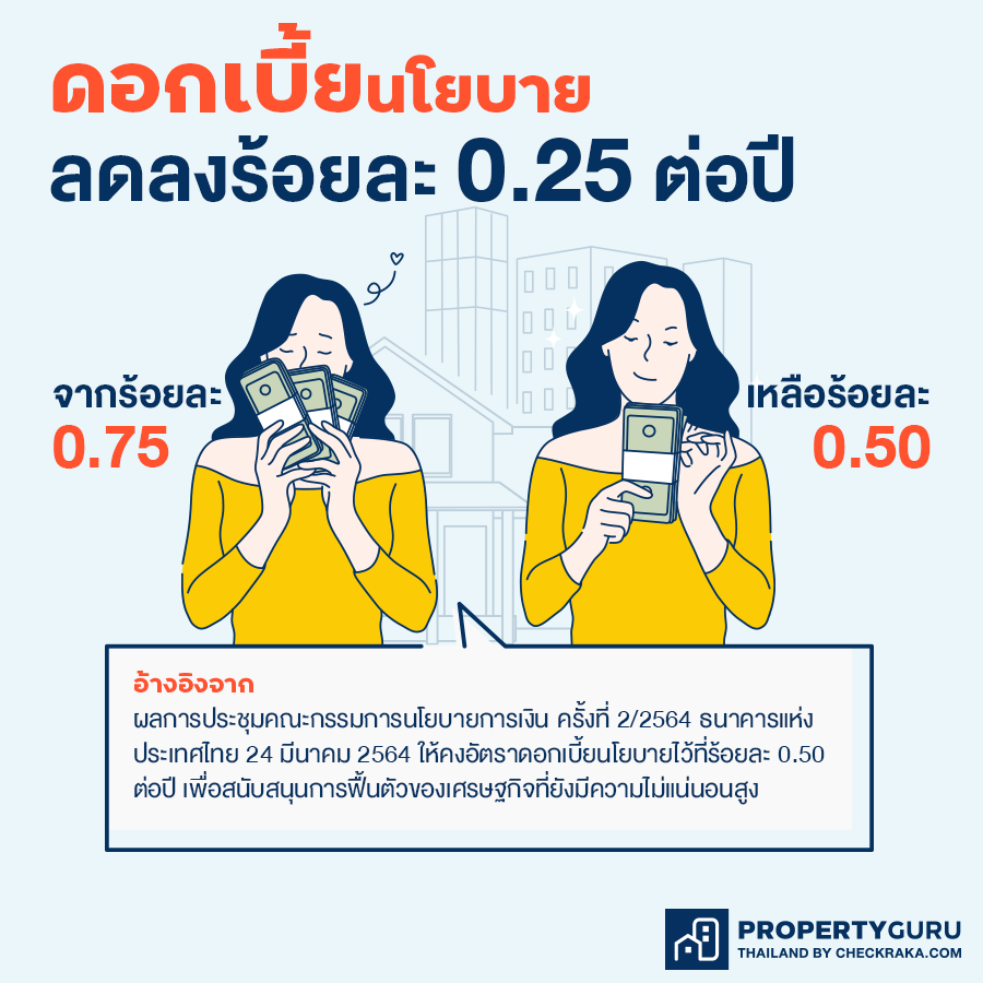ธนาคารแห่งประเทศไทยได้มีนโยบายกระตุ้นเศรษฐกิจ มีผลให้ดอกเบี้ยนโยบายลดลงร้อยละ 0.25 ต่อปี จากร้อยละ 0.75 เหลือร้อยละ 0.50 ต่อปี ทำให้ผู้ที่กู้ผ่อนต่อเดือนต่ำลงหลักพันจนไปถึงหลักหมื่นเลยค่ะ แบบนี้ยิ้งเป็นผลดีมากๆ สำหรับคนที่อยากมีบ้านเป็นของตัวเอง