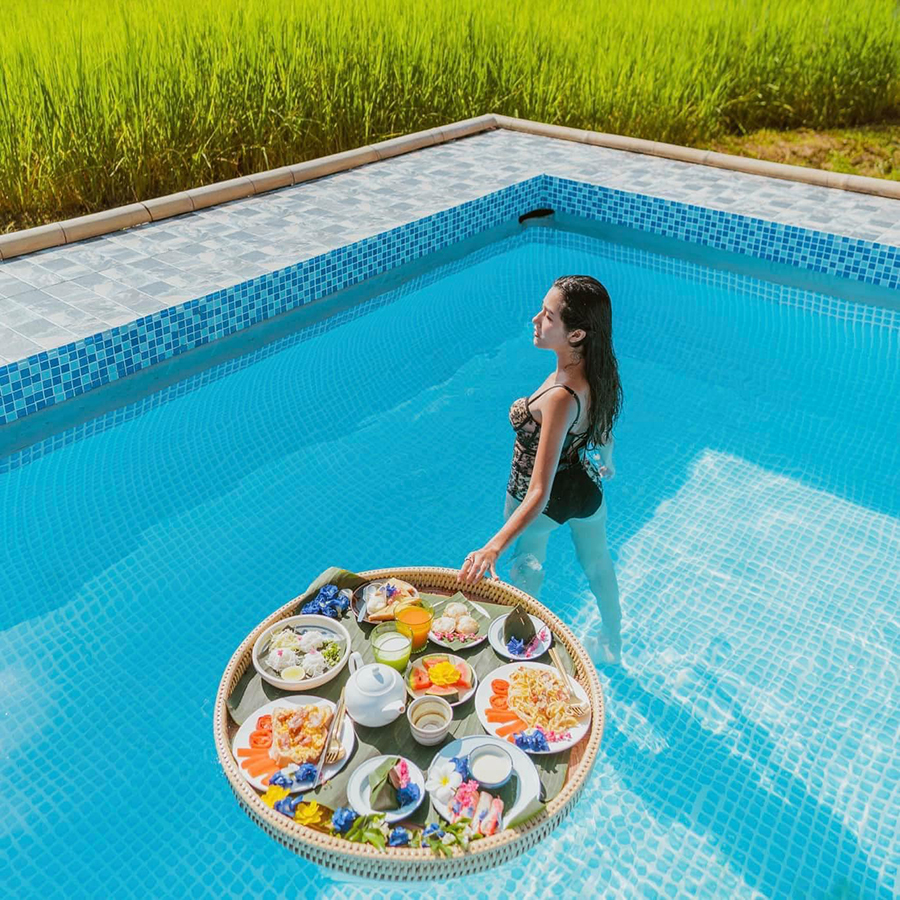 ส่วนการทานอาหารเช้าลอยน้ำนั้นคาดว่ามาจากการบริการของโรงแรมในบาหลี ประเทศอินโดนีเซีย ที่ส่วนใหญ่มักจะเป็นพูลวิลลา วิวทิวเขาและทะเล การเสิร์ฟ Floating Breakfast แสดงถึงการผักผ่อนแบบตามใจ สามารถนอน ทานอาหาร เล่นน้ำ ชมวิวก็สามารถทำไปพร้อมๆ กันได้ แถมยังได้ภาพสวยๆ กลับมาอีกด้วย การเสิร์ฟแบบนี้จึงเป็นที่นิยมกันมาเรื่อยๆ ในแถบเอเชียตะวันออกเฉียงใต้ และนิยมไปสู่ที่พักทั่วไปไม่มีวิวทิวทัศน์ การเสิร์ฟแบบนี้ก็จะช่วยให้นักท่องเที่ยวสนใจที่พักมากขึ้นได้
