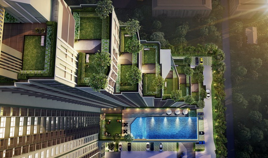 พื้นที่สีเขียวที่ออกแบบมาในแบบ Step Terrace Garden กระจายอยู่มากถึง 7 ชั้น ให้ลูกบ้านใช้พื้นที่สวนได้อย่างทั่วถึง