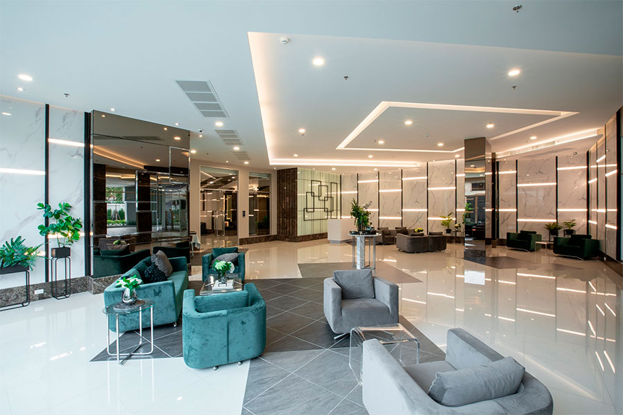 บรรยากาศบริเวณล็อบบี้เพดานสูงแบบ Double Volume ตกแต่งด้วยกระเบื้องลายหินอ่อนในโทนสีขาวเทา