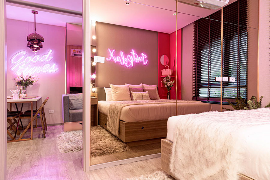 บรรยากาศห้องตัวอย่างพร้อม Smart Home Automation ที่ใช้งานปรับแสง สีไฟในห้อง