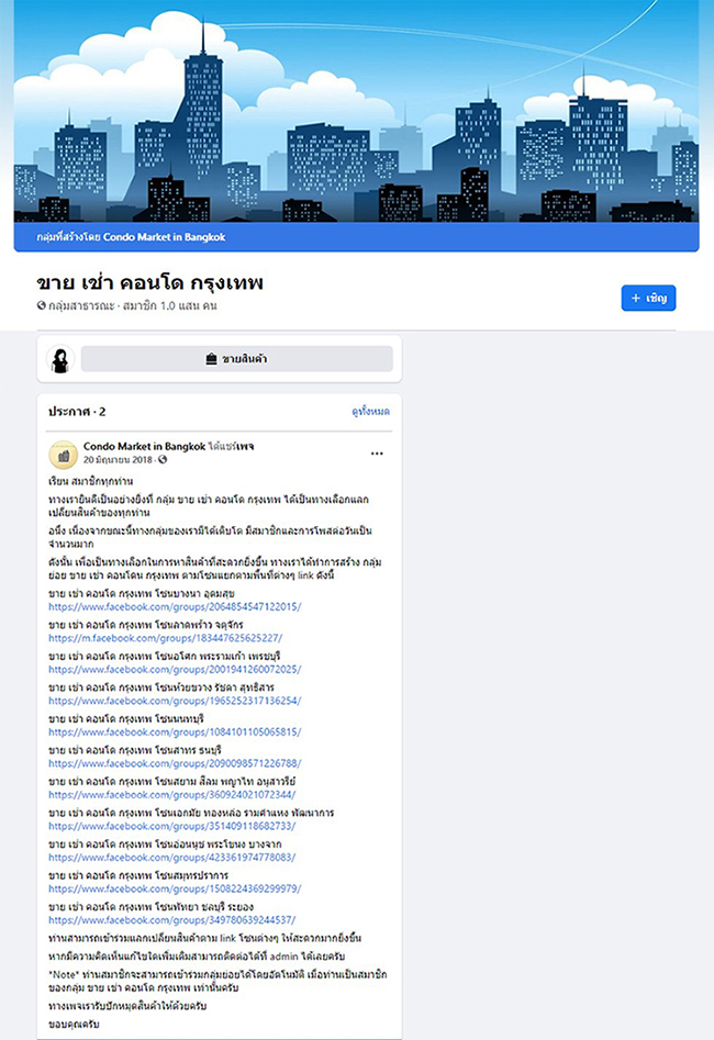 Facebook Group เป็นช่องทางที่ดีมากที่สุดอย่างหนึ่ง เพราะเป็น Community รวมคนที่สนใจเรื่องเดียวกันมาพูดคุยแลกเปลี่ยนเรื่องที่สนใจเหมือนๆ กัน มีหลายกลุ่มที่สร้างกลุ่มขึ้นมาเพื่อให้เจ้าของโพสต์ปล่อยเช่าห้องคอนโด โดยแนบภาพและข้อมูลห้อง เพื่อให้ผู้เช่าเข้ามาเลือกและติดต่อผ่านเจ้าของห้องได้โดยตรง วิธีนี้ยังสามารถทำได้โดยที่ไม่เสียค่าใช้จ่าย และสามารถเข้าถึงกลุ่มผู้เช่าได้โดยตรงเลยค่ะ เช่น กลุ่ม