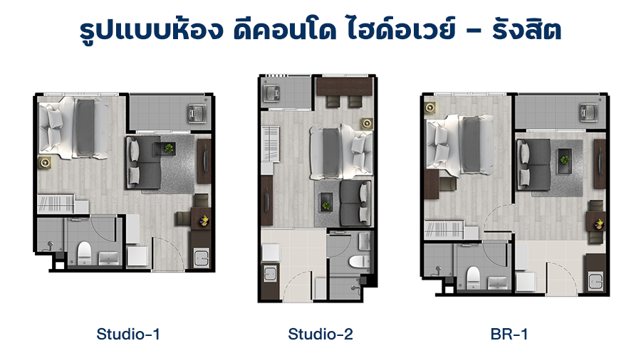 รูปแบบของห้อง แบ่งออกเป็น 3 รูปแบบ ดังนี้ - Studio Type 1 26 ตร.ม