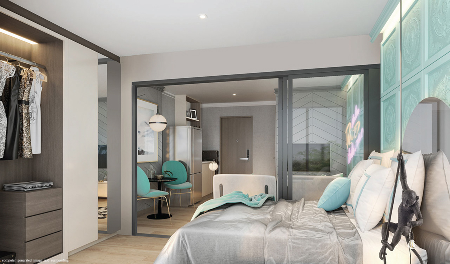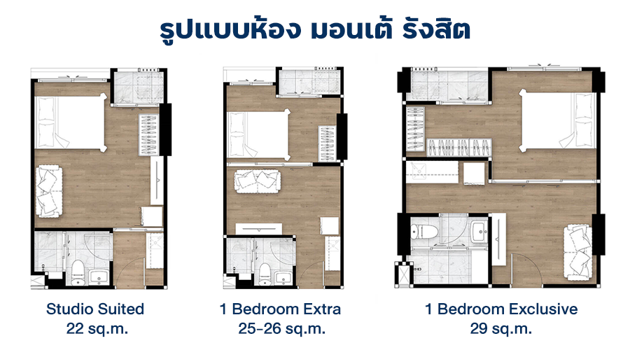 รูปแบบของห้อง มีให้เลือกทั้งหมด 3 รูปแบบ ดังนี้ - Studio Suited ขนาด 22 ตร.ม.