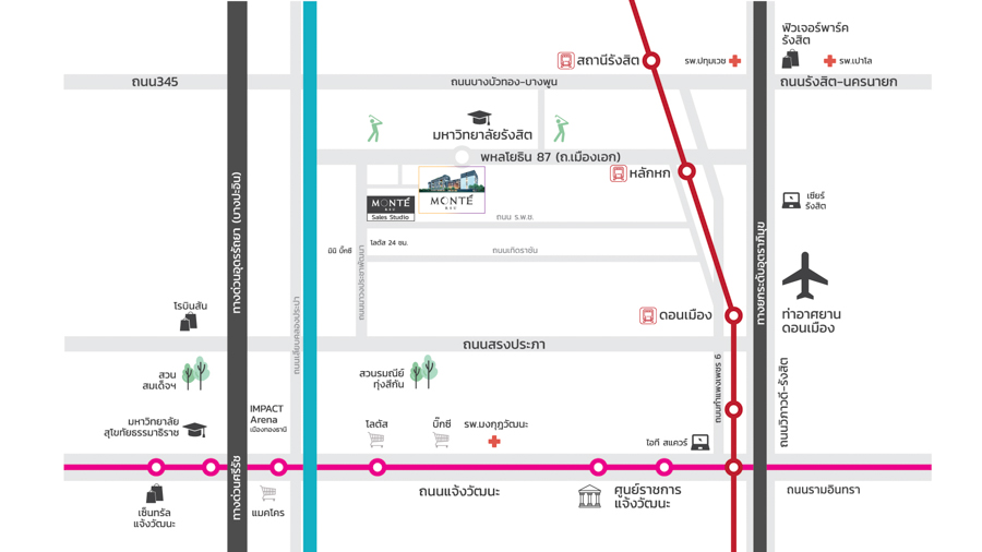 มอนเต้ รังสิต (Monte RSU) คอนโด Low-rise 8 ชั้น มี 3 อาคาร ตั้งล้อมสระว่ายน้ำ ส่วนกลางที่อยู่ตรงกลาง บนพื้นที่โครงการทั้งหมด 3 ไร่ 1 งาน 94 ตร.ว. ความน่าสนใจของโครงการนี้อยู่ที่ Location ตั้งอยู่ใกล้กับ ม.รังสิต ม.กรุงเทพ รังสิต ใกล้ห้างสรรพสินค้าอย่าง ฟิวเจอร์พาร์ค รังสิต เซียร์ รังสิต ที่สำคัญใกล้รถไฟฟ้าสายสีแดงเข้ม สถานีรังสิต และสถานีหลักหก