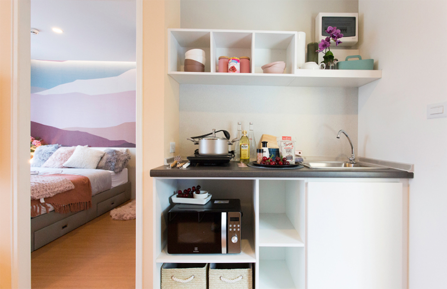 เสนาคิทท์ บีทีเอส สะพานใหม่ กั้นห้องด้วยประตูบานสไลด์ ข้อดีคือทำให้ห้องโล่ง ไม่อึดอัด อยากเป็นส่วนตัวก็ปิดเข้าได้ และครัวเป็นครัวปิด ส่วน