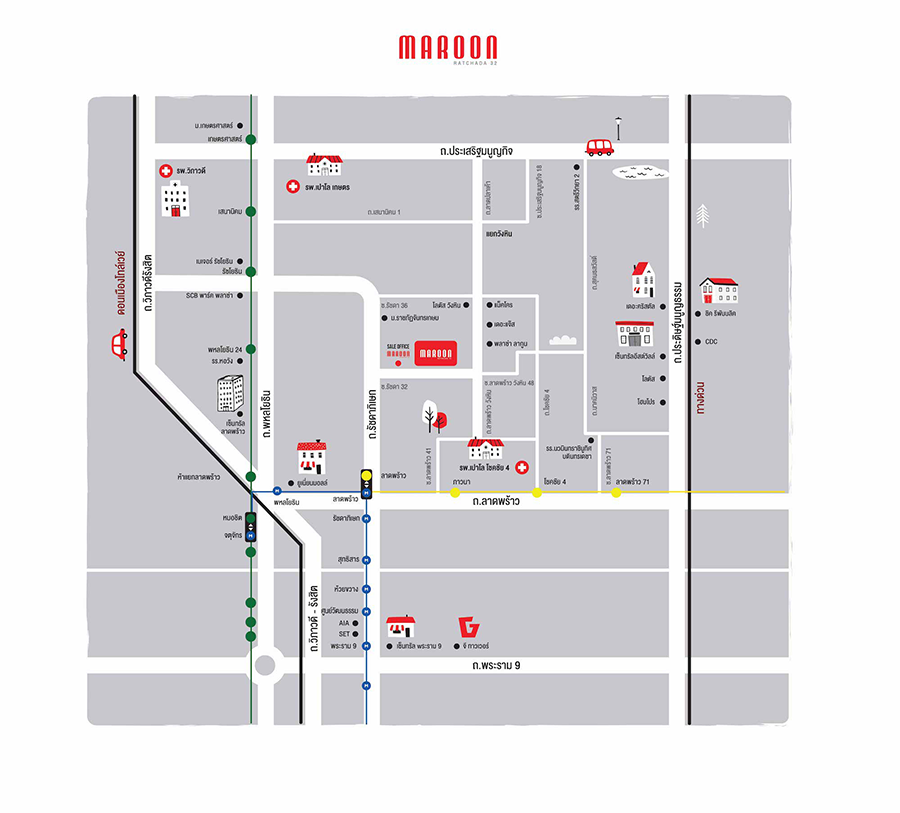 ชื่อโครงการ:มารูน รัชดา 32 (Maroon Ratchada 32)ราคา:เริ่มต้น 1,990,000 บาท (ณ. วันเปิดตัว)ราคาเฉลี่ยต่อตร.ม.:โปรดสอบถามข้อมูลกับทางโครงการคำนวณเงินผ่อน:ลักษณะกรรมสิทธิ์:โปรดสอบถามข้อมูลกับทางโครงการขนาดห้องที่มี:ตั้งแต่ 22.00 ถึง 34.00 ตร.ม.เนื้อที่ทั้งหมด:2 ไร่ 1 งาน 67.90 ตร.ว.จำนวนตึก:2 อาคารจำนวนชั้น:8 ชั้นจำนวนห้อง:353 ยูนิตที่จอดรถทั้งหมด:118 คันค่าบำรุงส่วนกลาง:โปรดสอบถามข้อมูลกับทางโครงการสาธารณูปโภค:สระว่ายน้ำ, ฟิตเนส, รปภ., กล้องวงจรปิดโครงการ, ประตู Key Card, ร้านซัก อบ รีด, สวนหย่อม, อื่นๆ (Mailbox, Board game corner, Man cave irish pub, Biz Lounge, Changing Room, Secret Bar, Secret Pool Lounge, Pool Bar), สนามออกกำลังกาย, ที่จอดรถที่ตั้งคอนโดมิเนียม:ซอยรัชดาภิเษก 36 แยก 19 แขวงจันทรเกษม เขตจตุจักร กรุงเทพมหานคร 10900
