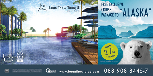 บริษัท ชาญอิสสระดีเวลลอปเม้นท์ จำกัด (มหาชน) จัดโปรโมชั่น จองซื้อคอนโด บ้านทิวทะเล รับฟรีทันทีแพ็คเกจล่องเรือสำราญ สุดพิเศษที่ Alaska บ้านทิวทะเลคอนโดมิเนียม ราคาเริ่มต้น 2.7 ล้านบาท