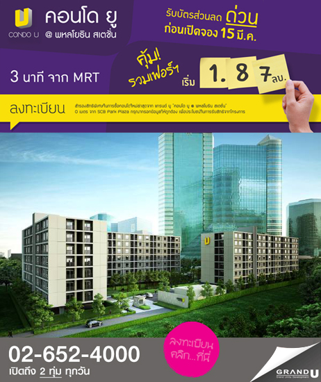 8 มี.ค. 56 8,274คอนโด ยู @ พหลโยธิน สเตชั่น 3 นาที จาก MRT พหลโยธินบริษัท แกรนด์ ยูนิตี้ ดิเวลล็อปเมนท์ จำกัด เปิดให้ลงทะเบียนสำรองรับสิทธิพิเศษในการซื้อคอนโดมิเนียมใหม่ล่าสุด คอนโด ยู @ พหลโยธิน สเตชั่น ชูจุดเด่น "3 นาทีจาก MRT พหลโยธิน" บนพื้นที่โครงการกว่า 4 ไร่ พร้อมพื้นที่ภายในโครงการที่เปิดโล่งกว่า 60% ให้คุณรู้สึกใกล้ธรรมชาติ โปร่งสบาย ไม่อึดอัด แม้จะอยู่ในย่านธุรกิจแห่งใหม่ของกรุงเทพฯ