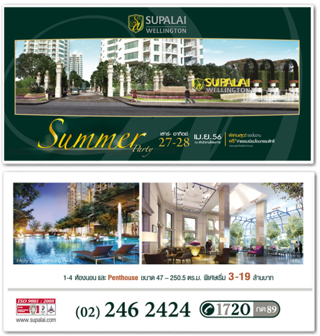 ขอเชิญร่วมงาน Summer Party ศุภาลัย เวลลิงตัน ในวันเสาร์-อาทิตย์ ที่ 27 - 28 เม.ย. 56 ณ สำนักงานขายโครงการ พิเศษสุด! จองในงาน ฟรีค่าธรรมเนียมโอนกรรมสิทธิ์
