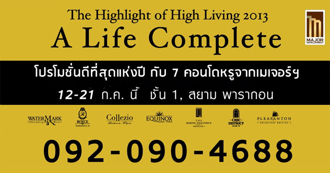 บริษัท เมเจอร์ ดีเวลลอปเม้นท์ จำกัด (MJD) ผู้พัฒนาโครงการอสังหาริมทรัพย์ระดับไฮเอนด์ชั้นนำของเมืองไทย เตรียมจัดงานมหกรรมคอนโดมิเนียมใหญ่แห่งปี The Highlight of High Living 2013 - A Life Complete ที่สุดแห่งชีวิตสมบูรณ์แบบ ซึ่งจะจัดขึ้นระหว่างวันที่ 12 - 21 กรกฎาคม 2556 นี้ ที่ชั้น 1 สยามพารากอน
