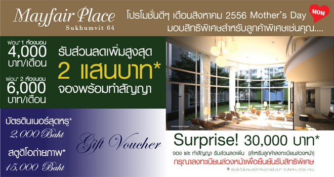 เมย์แฟร์ เพลส สุขุมวิท 64 (Mayfair Place Sukhumvit 64) จัดโปรโมชั่นพิเศษต้อนรับเดือนสิงหาคม โดยมอบส่วนลดสูงสุดถึง 200,000 บาท* พร้อมลุ้นรับ Gift Voucher บัตรดินเนอร์สุดหรู* (มูลค่า 2,000 บาท) หรือ Gift Voucher สตูดิโอถ่ายภาพ* (มูลค่า 15,000 บาท)