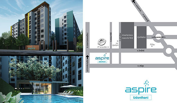 ภาพสถานที่จริงพร้อมแผนที่โครงการจาก AP ตั้งอยู่ที่ ถนนโพธิ์ศรี จ.อุดรธานี บนพื้นที่ 3 ไร่ 2 งาน 22 ตารางวา คอนโดสูง 8 ชั้น 2 อาคาร จำนวนยูนิตรวม 413 ยูนิต