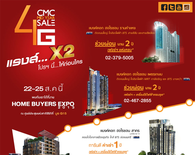 CMC MID YEAR SALE 4G แคมเปญใหญ่กลางปีของบริษัทเจ้าพระยามหานคร จำกัด (มหาชน) มอบส่วนลดทุกโครงการ พร้อมจับมือพันธมิตรทางการเงิน ธนาคารธนชาตมอบสิทธิพิเศษ โปรโมชั่น CMC ช่วยผ่อน 2 ปี และในงาน Home Buyers' Expo 2013 ที่จัดขึ้นในระหว่างวันที่ 22 - 25 ส.ค. นี้ CMC ได้เพิ่มความแรงของโปรโมชั่น CMC MID YEAR SALE 4G แรง x 2 มอบสิทธิพิเศษเพิ่มสำหรับลูกค้าที่จองในงาน Home Buyers' Expo 2013 เท่านั้น ลุ้นรางวัลจาก LUCKY DRAW และ Samsung Smart TV LED 50 นิ้ว 1 เครื่อง พร้อมส่วนลด และสิทธิประโยชน์อื่นๆ อีกมากมาย ท่านสามารถรับความพิเศษเช่นนี้ได้ที่บูธ CMC บูธ G15 โซน CG เท่านั้น