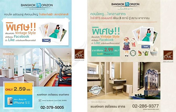 - พิเศษ!! เพียงแต่งตัว Vintage Style แล้วโพสต์ลง Facebook นำ Like มาแรกส่วนลดที่โครงการ Bangkok Horizon รามคำแหง และ Bangkok Horizon สาทร