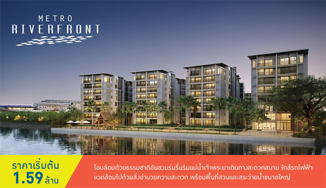 METRO RIVERFRONT รัตนาธิเบศร์ คอนโดรูปแบบใหม่สไตล์รีสอร์ท รองรับทุกไลฟ์สไตล์ของคนเมือง โอบล้อมด้วยธรรมชาติอันสงบร่มรื่นริมแม่น้ำเจ้าพระยา เดินทางสะดวก ใกล้รถไฟฟ้า ราคาเริ่มต้น 1.59 ล้านบาท จองภายในงานเลือกรับทันที