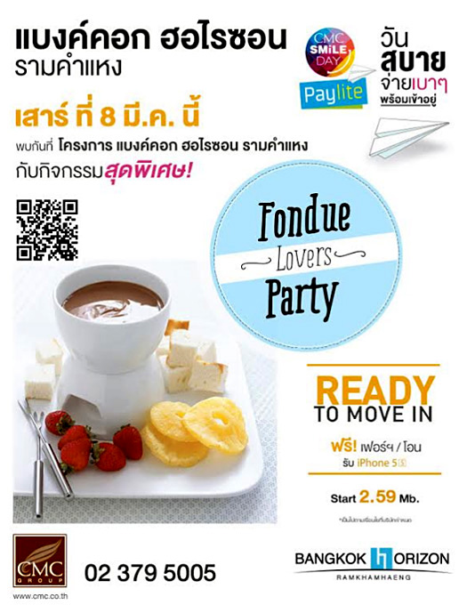 Bangkok Horizon รามคำแหง คอนโดมิเนียมในเครือ บริษัท เจ้าพระยามหานคร จำกัด (มหาชน) หรือ CMC Group จัดกิจกรรมพิเศษ เชิญคุณและและคนสนิท ปาร์ตี้สุดพิเศษ "Fondue Lovers Party" 8 มี.ค.57 นี้ พบกับราคาสุดพิเศษ เริ่มต้นที่ 2.59 ล้านบาท นอกจากนี้ยังมีโปรโมชั่นอัดแน่นที่ไม่มีใครเคยให้มากเท่านี้มาก่อน มอบให้สำหรับคนพิเศษเช่นคุณเท่านั้น