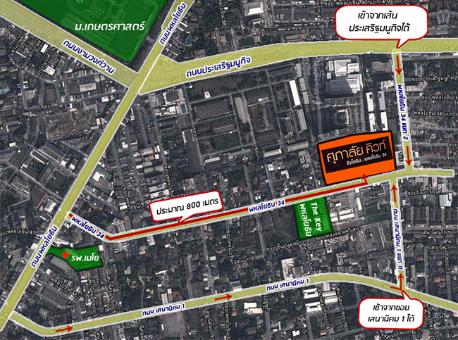 - เส้นทางที่สอง - จากถนนงามวงศ์วานเมื่อข้ามสะพานข้ามแยก ถ.งามวงศ์วาน ตัดกับ ถ.วิภาวดี เมื่อลงจากสะพานแล้วให้ชิดซ้ายไว้เพื่อตรงไปทางแยกเกษตรฯ เมื่อถึงแยกเกษตรฯ ให้เลี้ยวขวาตรงไปประมาณ 400 จะเจอกับ ซ.พหลโยธิน 34