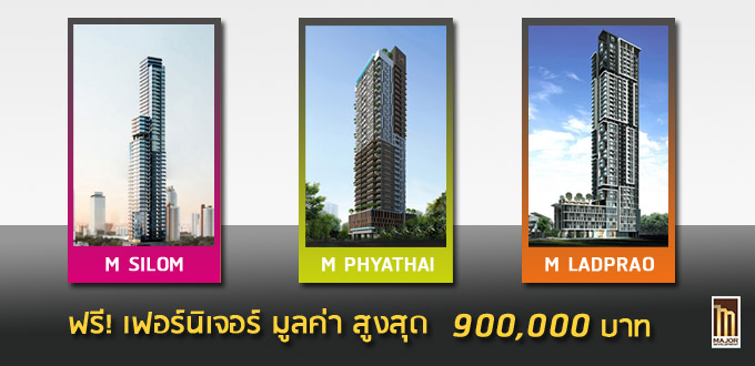 บริษัท เมเจอร์ ดีเวลลอปเม้นท์ จำกัด (มหาชน) ผู้พัฒนาโครงการอสังหาริมทรัพย์หรูเหนือระดับใจกลางเมือง จัดโปรโมชั่นคอนโดมิเนียม 3 โครงการแบรนด์ M ประกอบด้วย M Silom, M Phyathai และ M Ladprao ฟรีเฟอร์นิเจอร์มูลค่าสูงสุด 900,000 บาท ซึ่งทั้ง 3 โครงการนี้เป็นโครงการทำเลศักยภาพใกล้รถไฟฟ้า และใกล้เสร็จพร้อมเข้าอยู่ในอีกไม่นานนี้