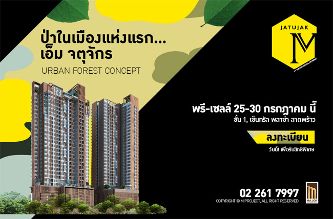 เอ็ม จตุจักร (M Jatujak) คอนโดมิเนียมแนวคิด Urban Forest (ป่าในเมือง) เสมือนพักอาศัยอยู่ในป่าขนาดใหญ่ บนพื้นที่เขียวขจีกว่า 4 ไร่ ประกอบด้วยอาคารชุด 2 อาคาร ได้แก่ อาคาร A สูง 32 ชั้น และอาคาร B สูง 34 ชั้น รวมทั้งสิ้นกว่า 800 ยูนิต ห้องชุดแบ่งออกเป็น 6 ประเภท ได้แก่ 1 ห้องนอนสวีท ,1 ห้องนอน ดูเพล็กซ์, 1 ห้องนอน, 2 ห้องนอน ดูเพล็กซ์, 2 ห้องนอน และ 3 ห้องนอน ขนาดตั้งแต่ 28.00 - 118.00 ตร.ม. เพียบพร้อมด้วยสิ่งอำนวยความสะดวกภายในโครงการกว่า 60 รายการ ราคาเริ่มต้น 3.5 ล้านบาท สำหรับผู้ที่สนใจสามารถลงทะเบียนเพื่อรับสิทธิพิเศษได้แล้วที่ลิงก์ด้านล่างนี้