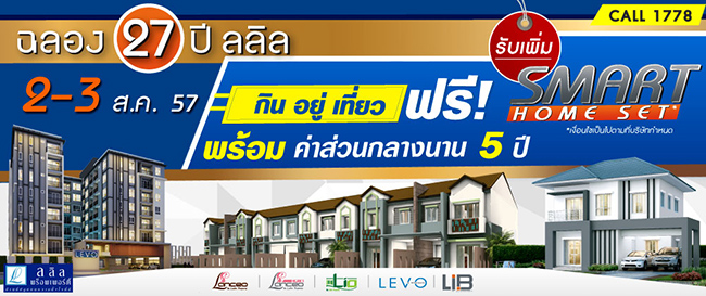 บริษัท ลลิล พร็อพเพอร์ตี้ จำกัด (มหาชน) จัดกิจกรรมโปรโมโมชั่นพิเศษ "ลลิล พร็อพเพอร์ตี้ กิน อยู่ เที่ยวฟรี พร้อมค่าส่วนกลางนาน 5 ปี" สำหรับบ้าน คอนโด ทาวน์โฮม พร้อมรับข้อเสนอพิเศษสุดคุ้ม ฟรีชุด Smart Home Set เนื่องในโอกาสครบรอบ 27 ปีของการดำเนินงานสำหรับลูกค้าที่จองโครงการที่เข้าร่วมรายการ เฉพาะในวันที่ 2-3 สิงหาคม 2557 นี้เท่านั้น