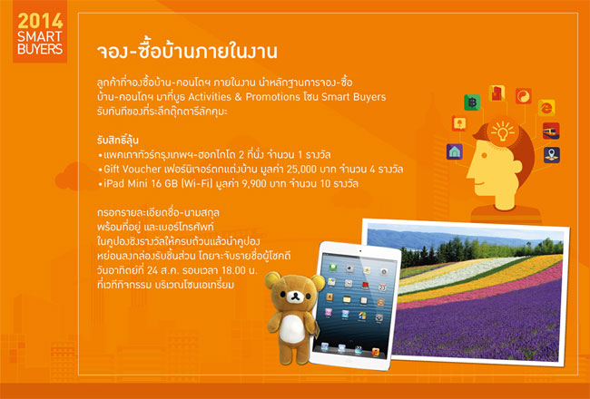 พิเศษ!! พบกับโซน Smart Buyers บริการให้คำปรึกษาเพื่อการเลือกซื้อบ้านอย่างชาญฉลาด โดยผู้เชี่ยวชาญ บริการตรวจสอบอัตราดอกเบี้ยที่อยู่อาศัย, บริการให้คำปรึกษาการประเมินทรัพย์สิน, บริการด้านข้อมูลอสังหาริมทรัพย์จากศูนย์ข้อมูลอสังหาริมทรัพย์ และบริษัทข้อมูลเครดิตแห่งชาติ ที่พร้อมให้บริการตรวจสอบข้อมูลเครดิตภายในงาน และกิจกรรมแลกเปลี่ยนใบจองคอนโดฯ ตลาดนัดผู้ซื้อพบผู้ขาย พร้อมชมนิทรรศการโครงข่ายรถไฟฟ้า 10 สาย, แผนที่ผังเมืองกรุงเทพฯ และปริมณฑล, โครงข่ายรถไฟทางคู่, แผนที่มอเตอร์เวย์ 4 เส้นทาง และแผนที่ทางด่วนทางใหม่