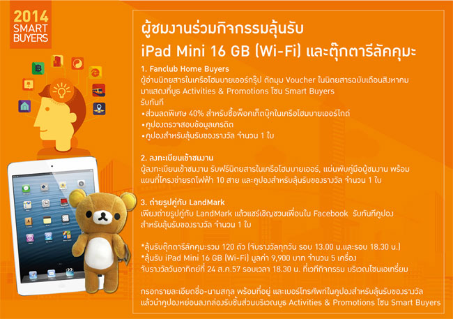 www.home.co.th ล่วงหน้าลุ้นรับ iPad Mini 16 GB (Wi-Fi) จำนวน 10 เครื่อง และของรางวัลพิเศษมากมายภายในงาน อาทิ