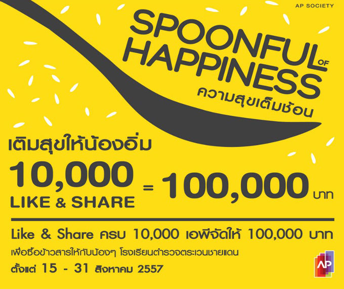 เพราะความสุขเกิดขึ้นได้เพียงท้องอิ่ม บริษัท เอพี (ไทยแลนด์) จำกัด (มหาชน) จึงขอเชิญชวนเพื่อนๆ ทุกคนมาร่วมมอบความสุขให้เต็มอิ่ม กับโครงการ "Spoonful of happiness-ความสุขเต็มช้อน" เพียงแค่ 1 Like หรือ 1 Share ของคุณ ในภาพนี้ รวมกันครบ 10,000 จะถูกเปลี่ยนเป็นเงินจํานวน 100,000 บาท เพื่อบริจาคข้าวสารให้กับน้องโรงเรียนตํารวจตระเวนชายแดนประเทศไทยทันที ตั้งแต่วันนี้ถึง ถึงวันที่ 31 สิงหาคม 2557